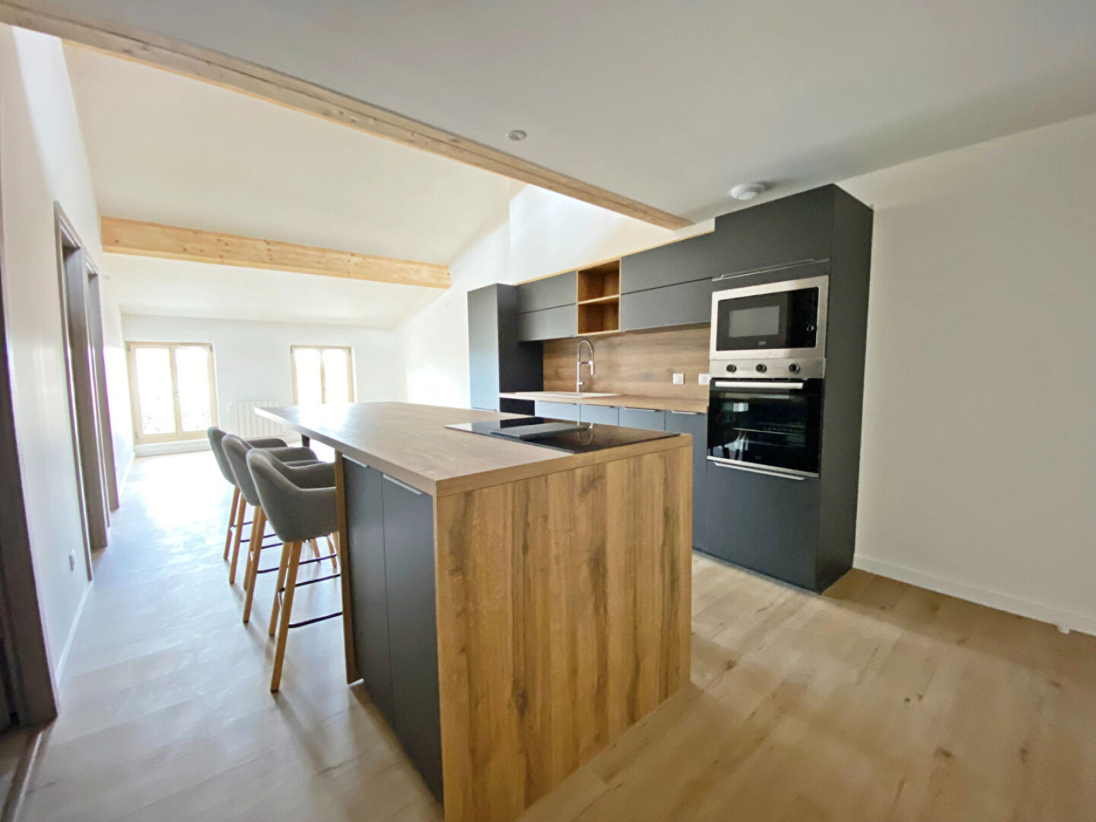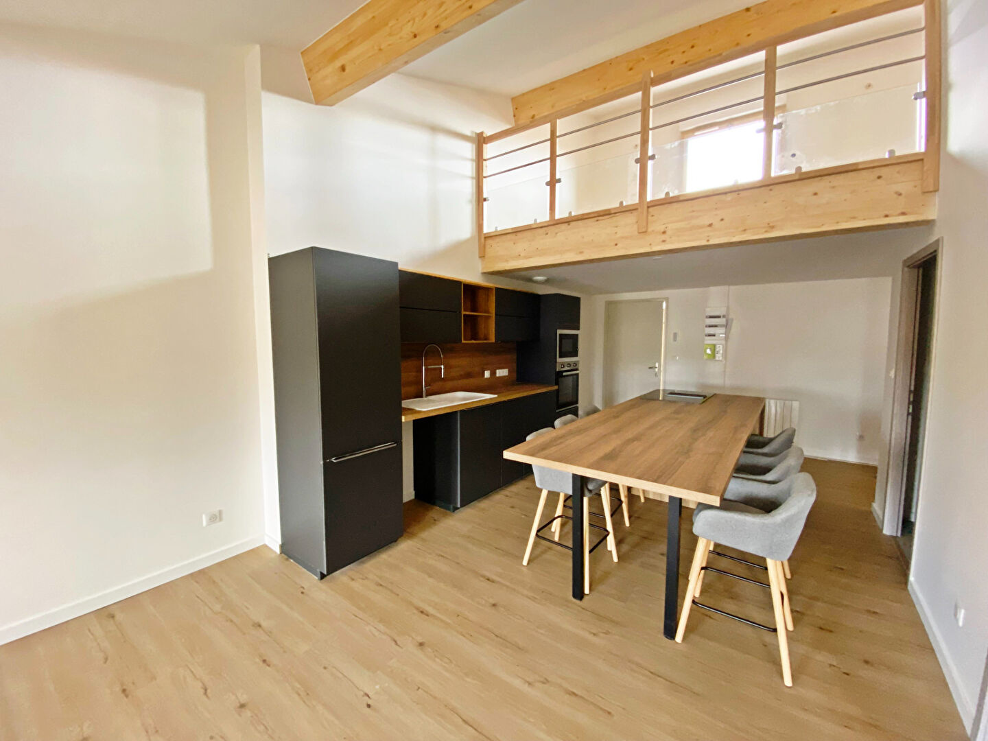 Vous y trouverez une belle cuisine équipé ouverte sur un salon séjour lumineux, 2 chambres, une mezzanine, salle d'eau et WC indépendant.