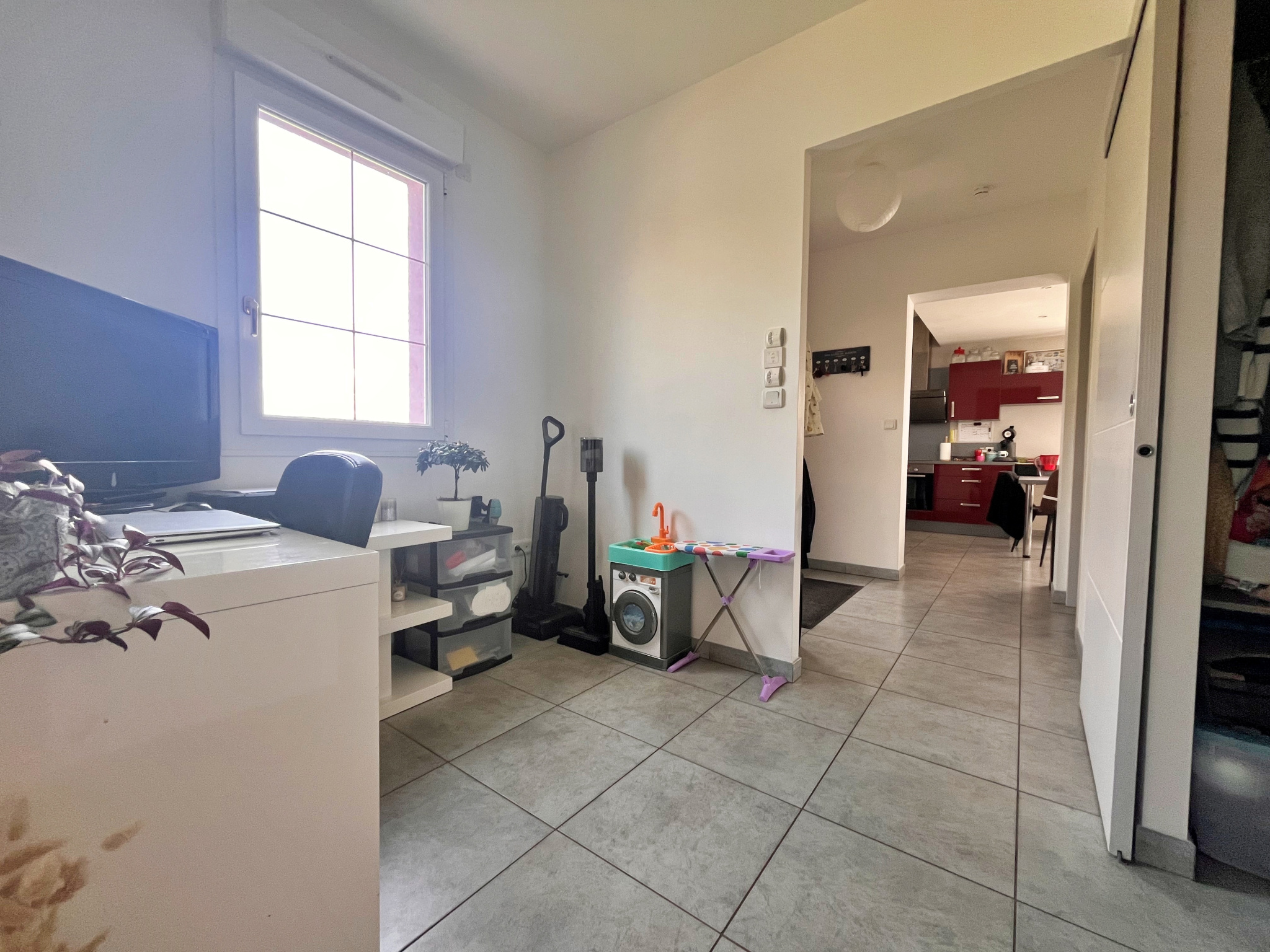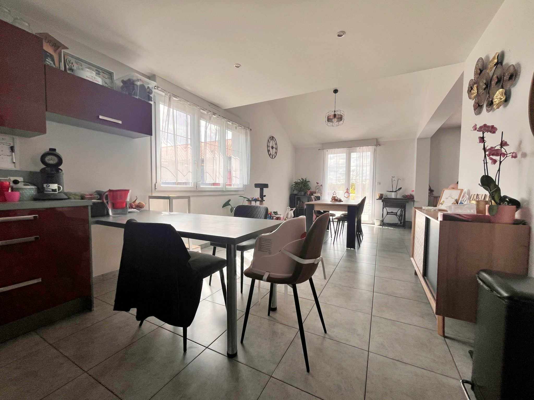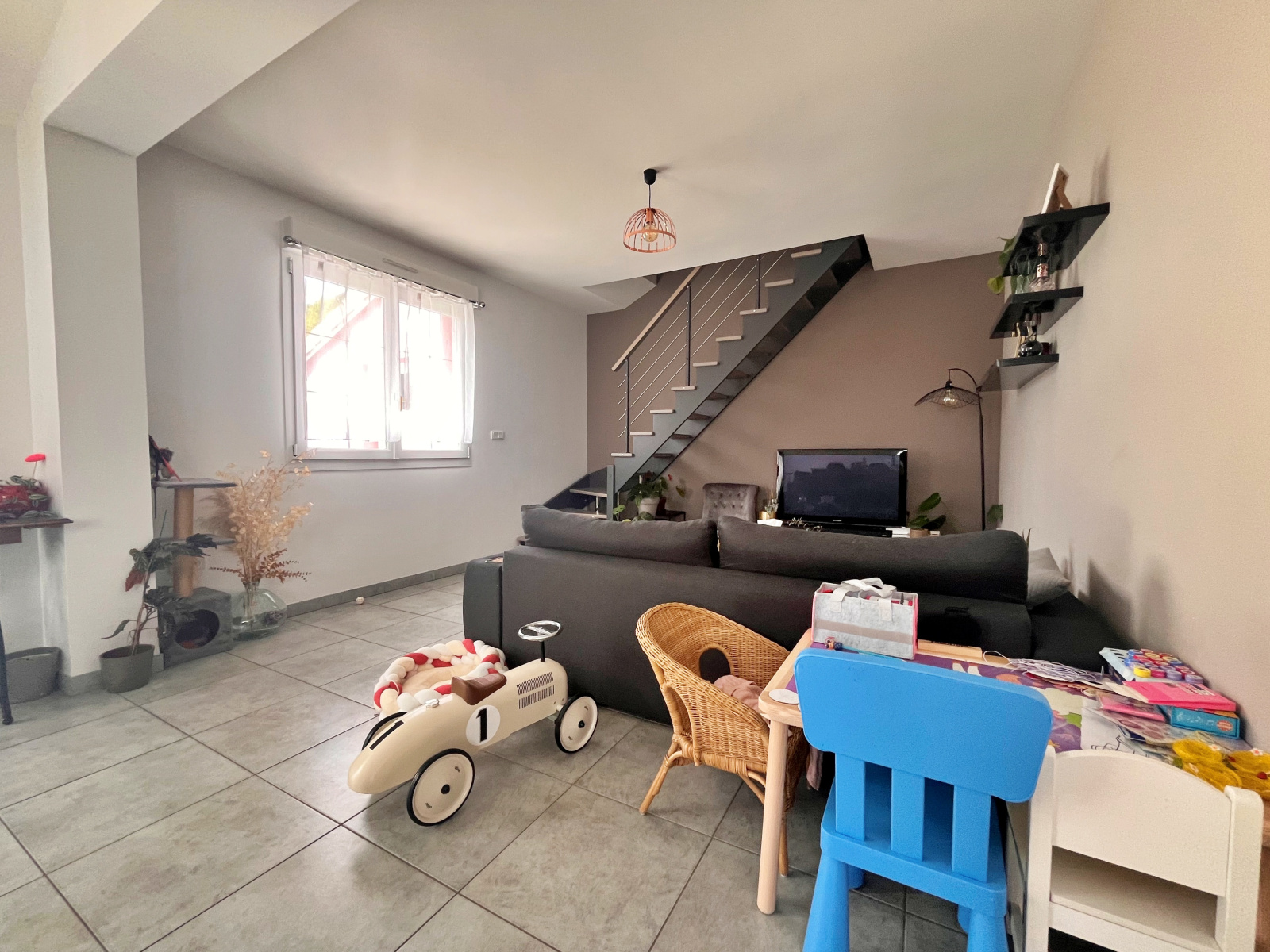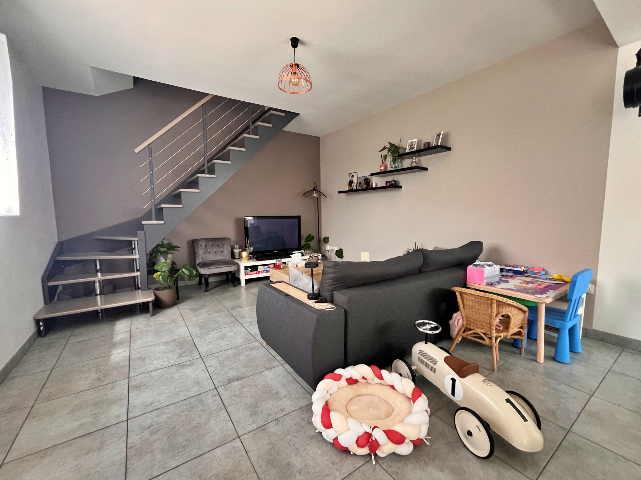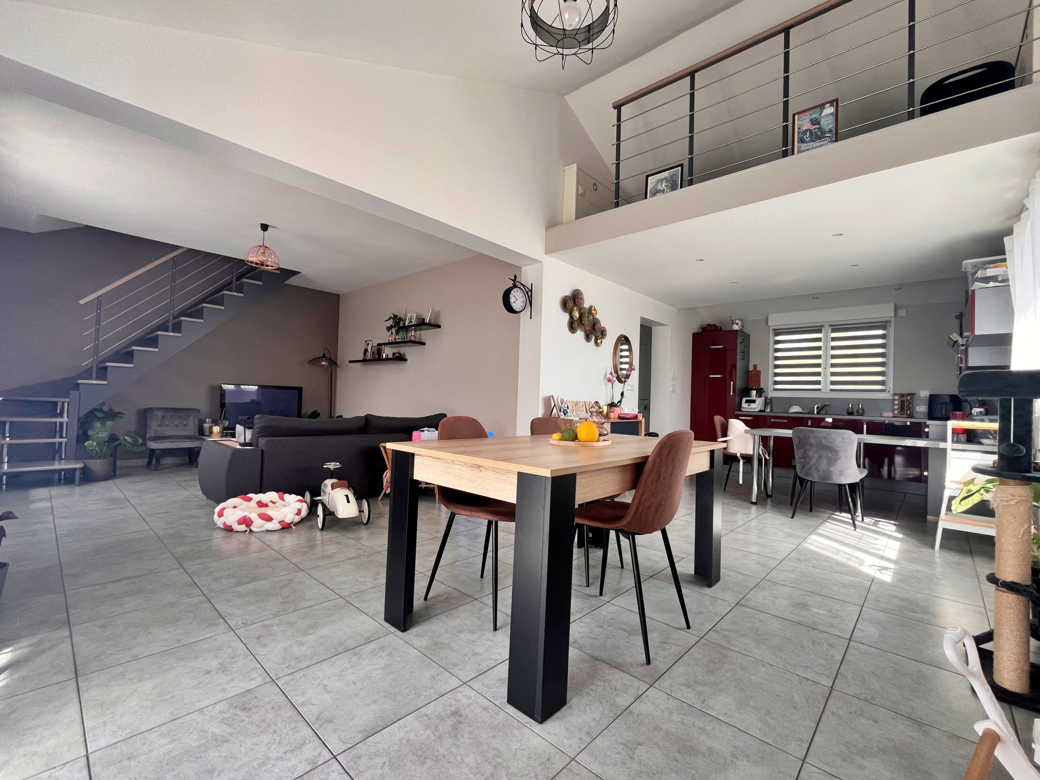 Dès l’entrée, vous découvrirez une belle pièce de vie spacieuse et baignée de lumière, avec une cuisine équipée ouverte, idéale pour partager des moments conviviaux. Une mezzanine vient sublimer cet espace et apporte un cachet supplémentaire à l’ensemble.
