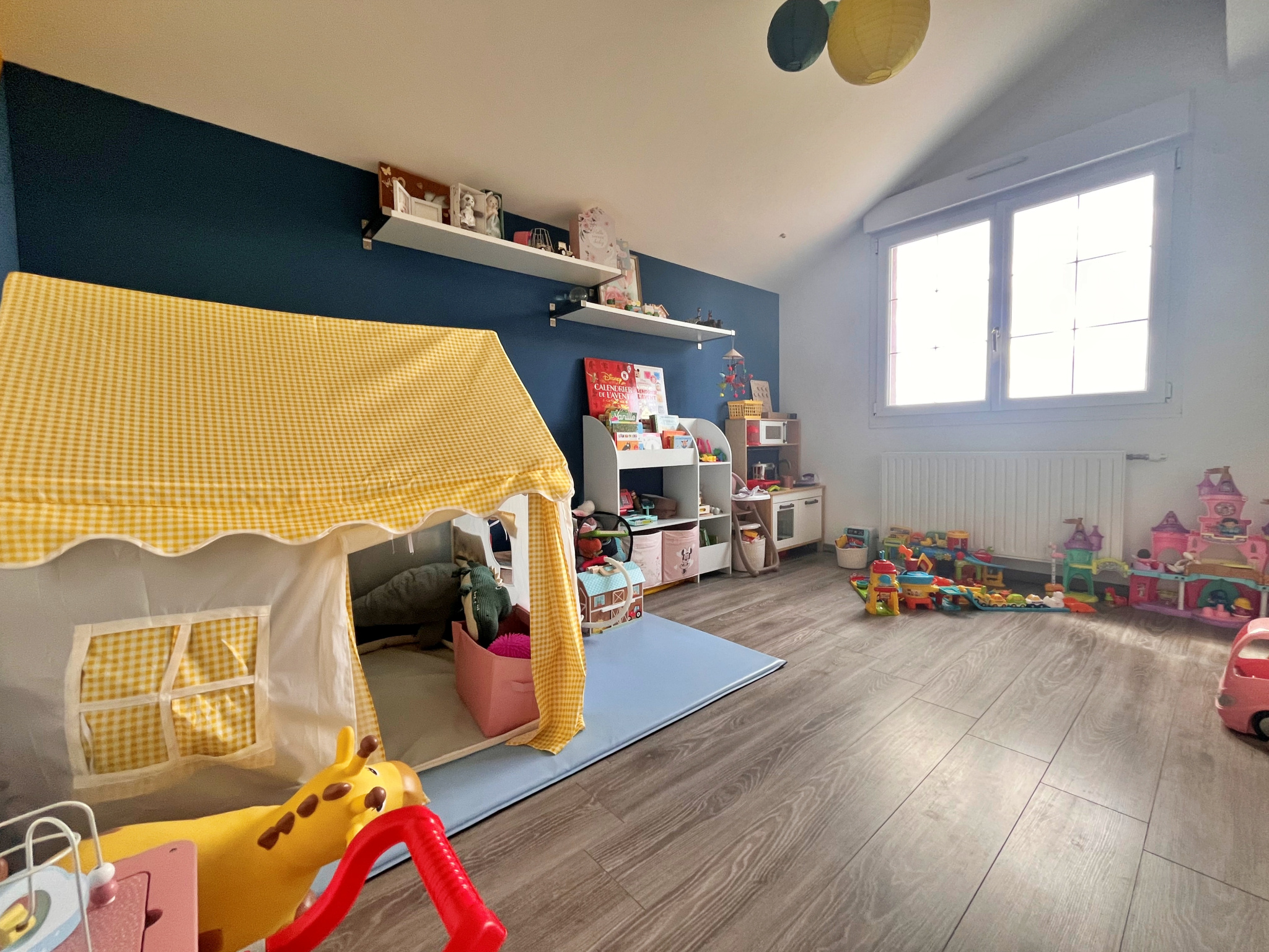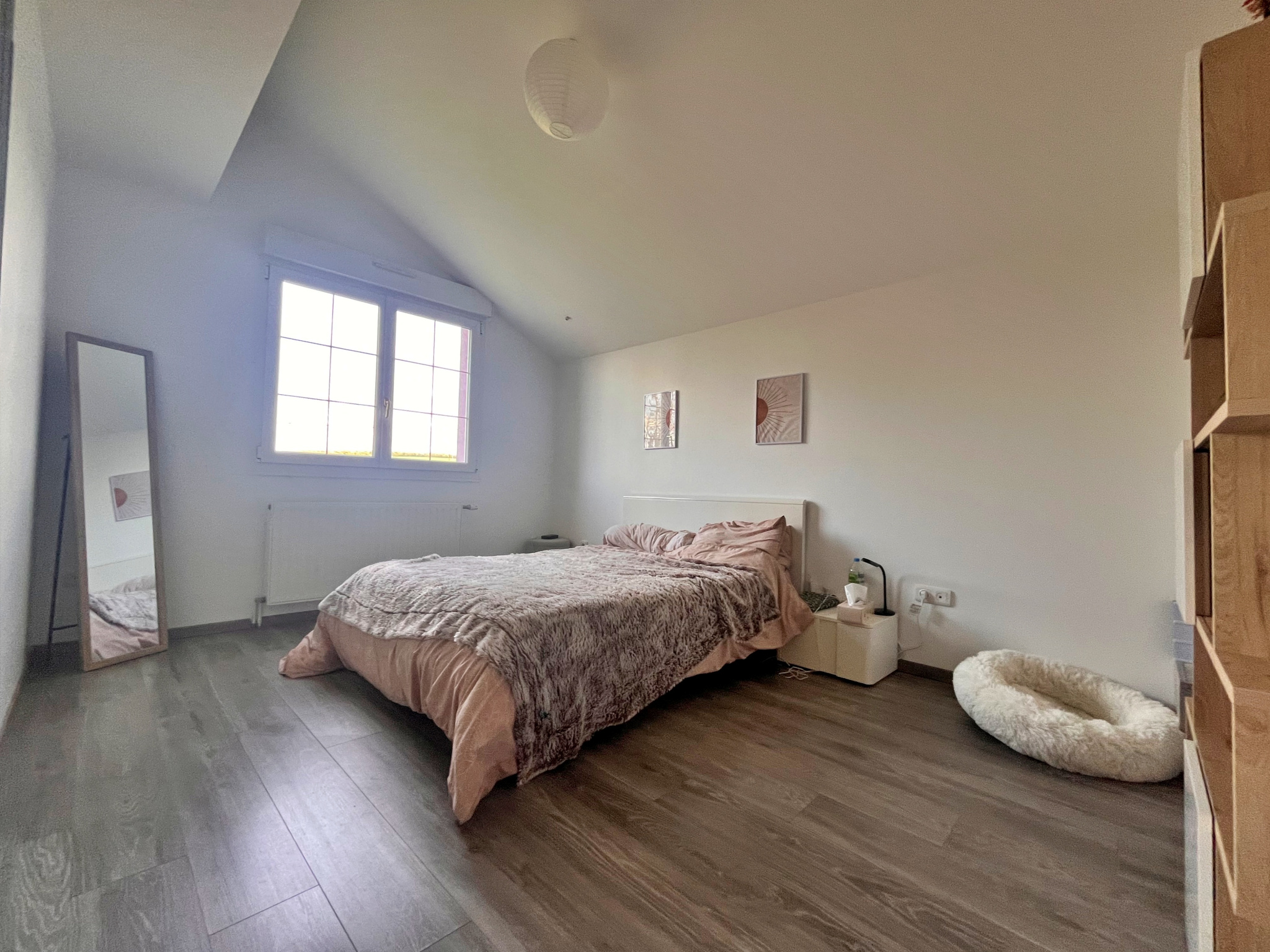 À l’étage, l’espace nuit se compose de trois belles chambres, toutes dotées de placards intégrés. On y retrouve une salle d’eau moderne avec douche à l’italienne, et un second WC séparé.