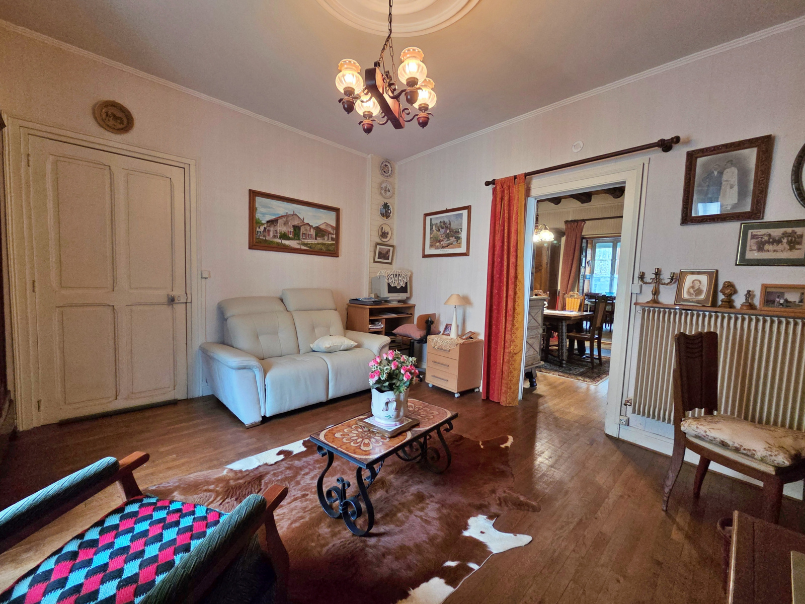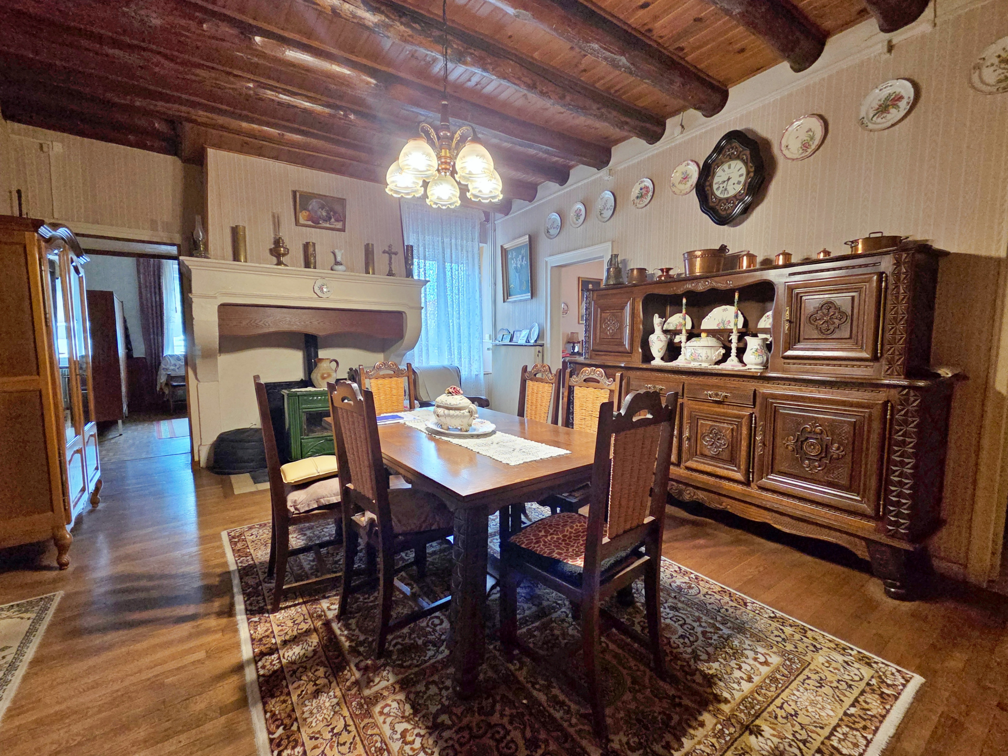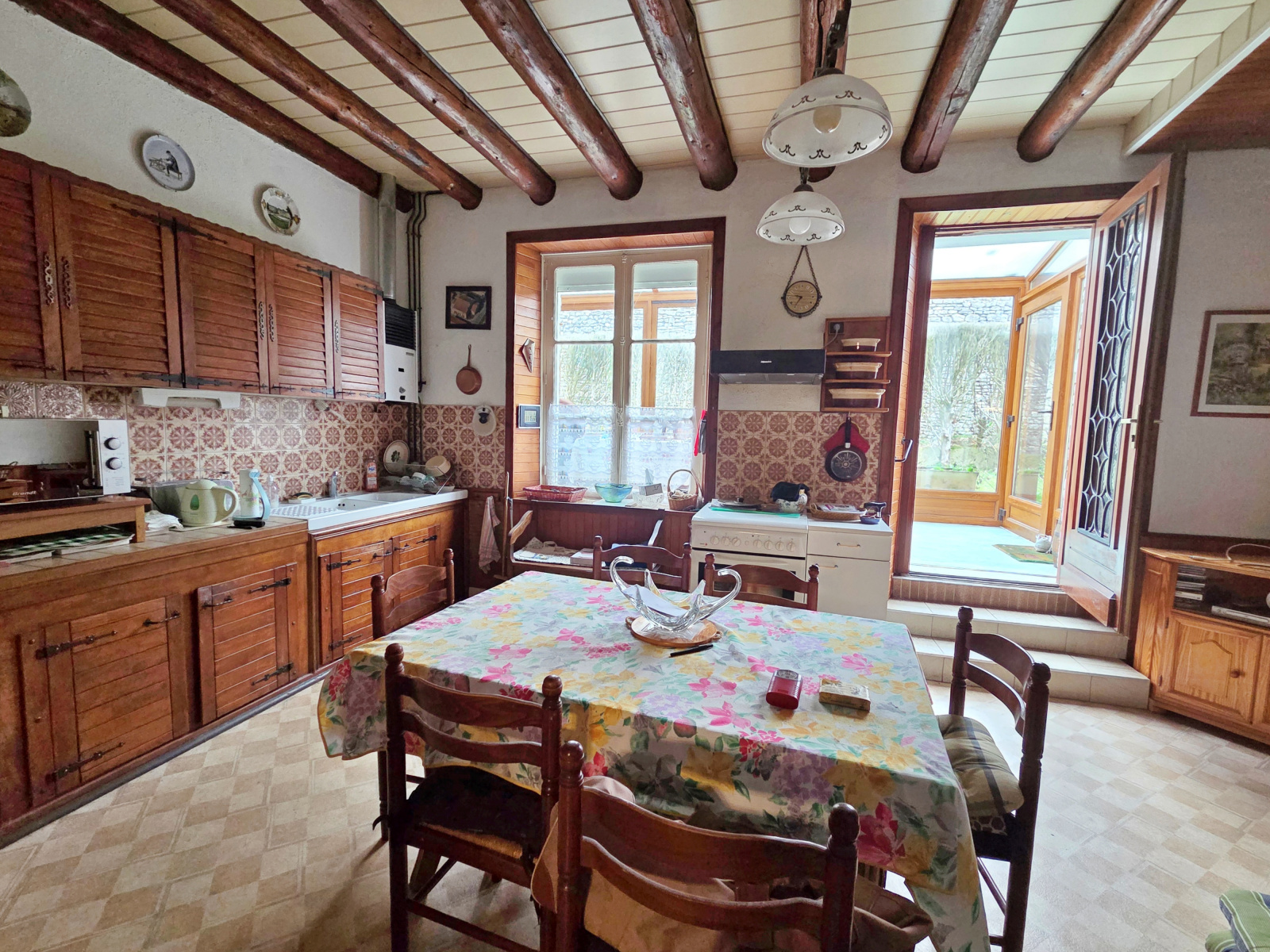 Une maison de village d'environ 120m² habitables de plain-pied, composée d'une entrée, cuisine meublée avec accès direct dans la véranda, salle à manger avec poêle à bois, salon avec parquet chêne, deux chambres, WC, salle d'eau.